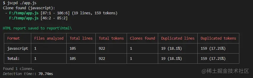 由此可知,./app.js 检测1个文件,发现了1个重复快,在总行数为105行的代码中,共有19行代码完全重复,重复度为 18.1%。