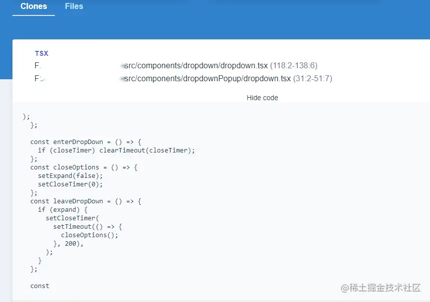 上图可以看到,在两个 tsx 组件文件中,存在一段重复的代码,也标识除了这两段代码在文件中具体行数。