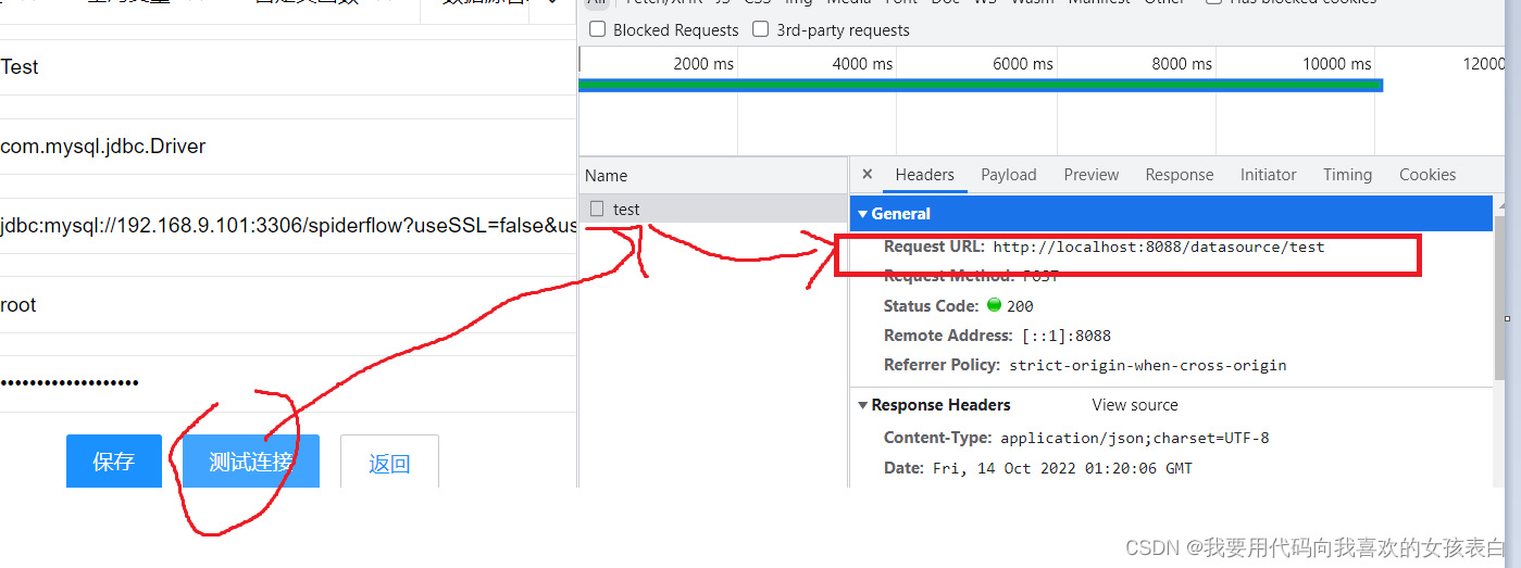 然后点击页面的按钮,就会发送http请求。比如我点击测试连接。