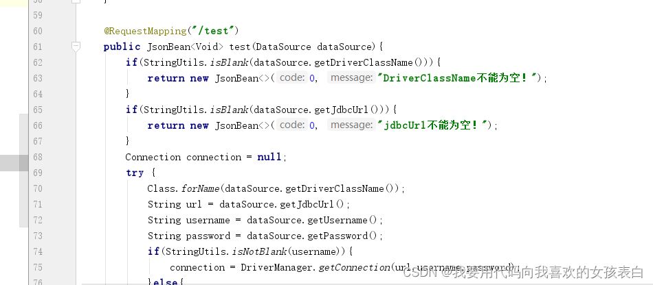 他就从测试连接,执行了这个test请求,这个请求实际是走的右边那个接口(接口就是亲密接触,和界面交互的地方),接口就是后端(服务器端)服务的一部分。