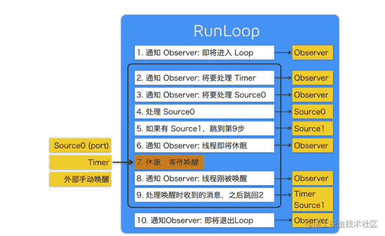一个管理输入源(手势、Selector等)的对象,Runloop即运行循环,是iOS中的消息处理机制,其主要作用是控制NSRunLoop里面线程的执行和休眠,当某个事件执行完成后,不退出其线程而进入休眠状态,当再次检测到事件时。唤醒休眠的线程继续处理事件。RunLoop可以保持程序的持续运行,并节省CPU资源,提高程序性能。