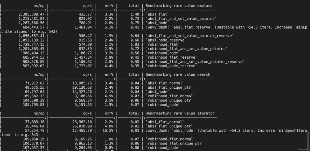 可以看到,在value copy rare的场景,absl的性能完全遵循上面提到的规则,而robinhood在这种情况下,emplace+construct+deconstruct是node更快,查找和遍历几乎和flat没区别。横向对比absl和robinhood两者的话,在查找和遍历上都是absl更快,emplace+construct+deconstruct在优化到极致的情况下两者差不多,robinhood并没有比absl快多少。当然,这只是简单测试,针对key类型不同的场景可能两者速度不太一样,具体就需要更加详细的benchmark了。