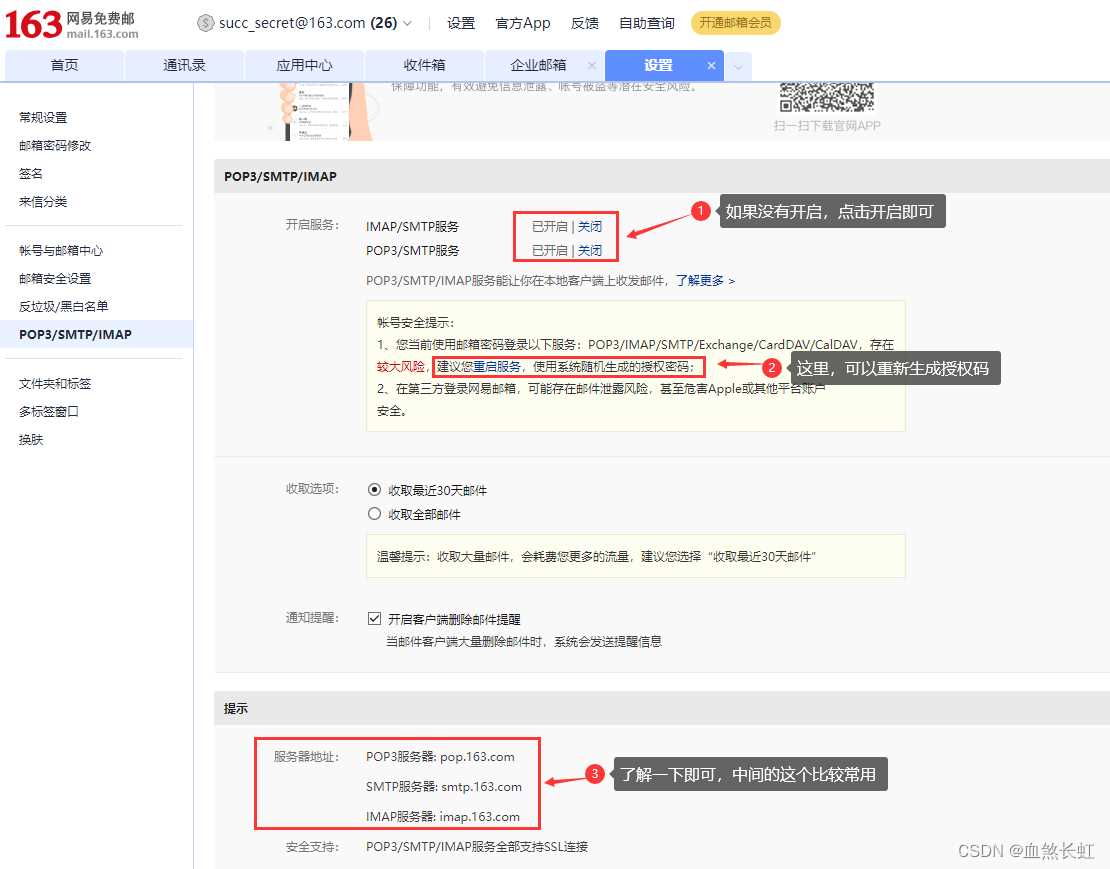 注意:下面的邮箱地址,是你自己的邮箱(作为邮件的发送者);密码是对应邮箱的登录密码或授权码,授权码在下方会有详细介绍,本文以163邮箱为例!
