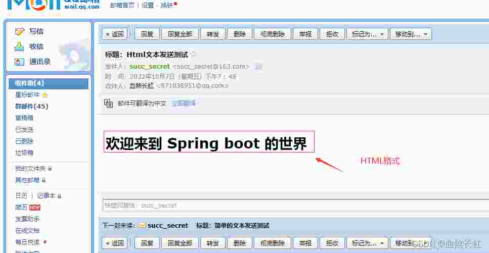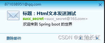 # 发送邮件的服务器, # QQ 邮件:smtp.qq.com # 如果是163邮箱,变更为“smtp.163.com”即可 spring.mail.host=smtp.163.com #你的邮箱地址 spring.mail.username=123456789@163.com #授权码,或邮箱登录密码 spring.mail.password=123456 #是否开启验证 true为开启,false不开启 spring.mail.properties.mail.smtp.auth=true #通讯是否加密,true开启,false不开启 spring.mail.properties.mail.smtp.starttls.enable=true #是否必须通过使用加密通讯进行通讯,true开启,false不开启 spring.mail.properties.mail.smtp.starttls.required=true