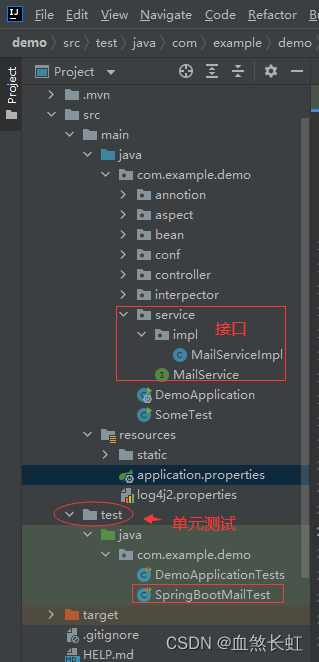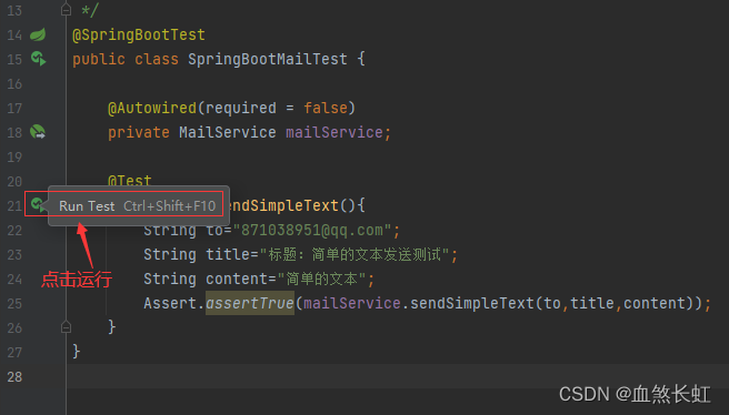 2、在test单元测试目录,新建SpringBootMailTest.java类