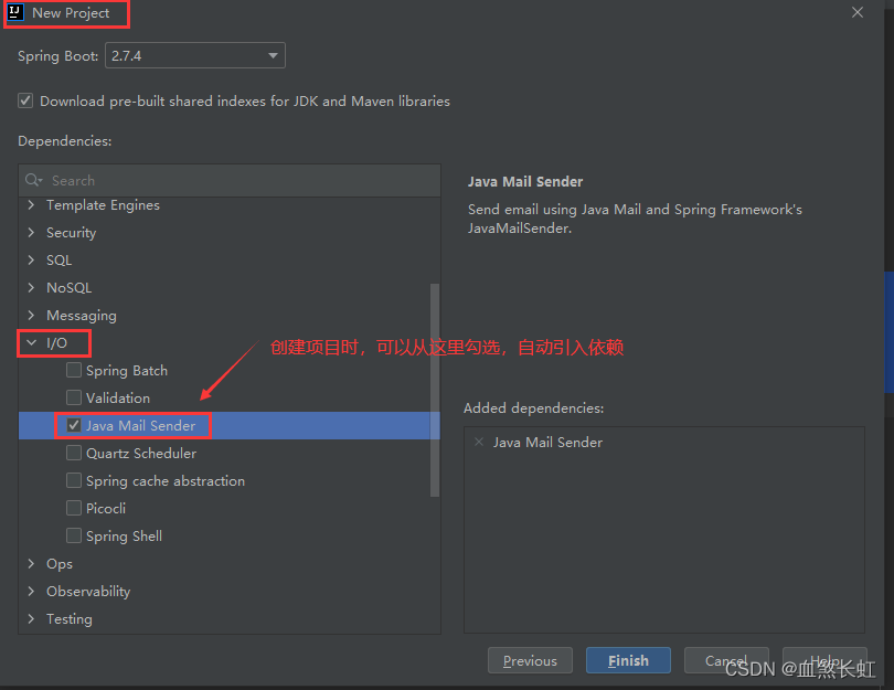 勾选后,spring-boot-starter-mail 依赖会被自动引入到pom.xml中