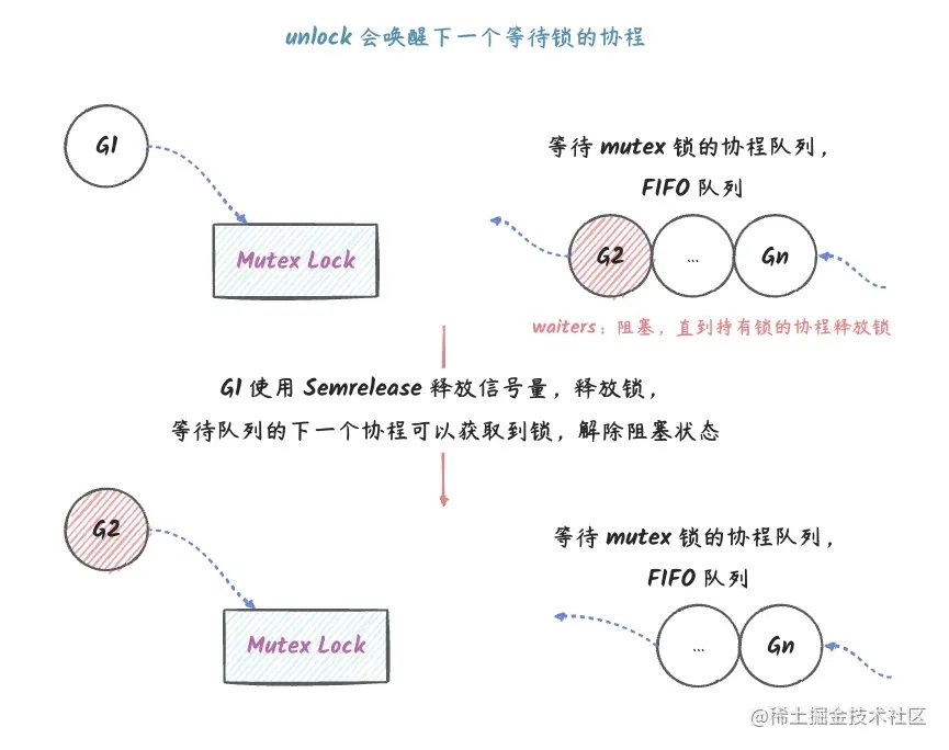 Unlock来释放锁,这个时候等待队列的下一个协程可以获取到锁(实际实现比这里说的复杂很多,后面会细说),从而进入临界区。 - 等待的协程会在