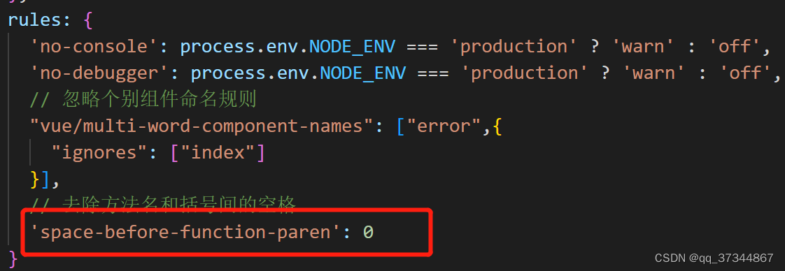 rules: { 'no-console': process.env.NODE_ENV === 'production' ? 'warn' : 'off', 'no-debugger': process.env.NODE_ENV === 'production' ? 'warn' : 'off', // 忽略个别组件命名规则 "vue/multi-word-component-names": ["error",{ "ignores": ["index"] }] }