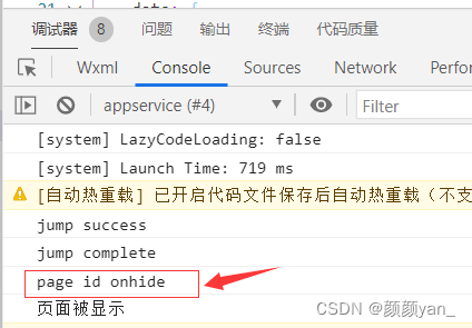 可以看到,点击“开启小程序之旅”跳转后,控制台出现了“jump success”和“jump complete”,说明跳转成功了。