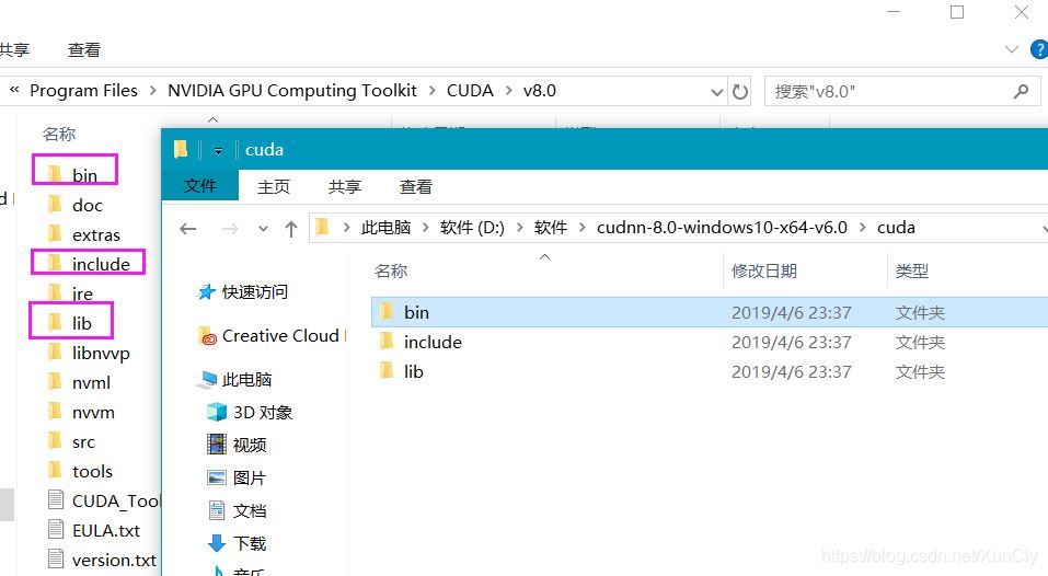 cuDNN称不上安装,只需要将下载下来的压缩包解压后,将对应文件夹的文件放到CUDA安装路径下的对应文件夹里即可