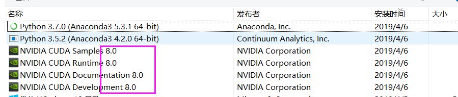 CUDA的卸载:控制面板-卸载程序(不要用360等杀毒软件,找不到对应程序的),按照安装时间排序,最上面这几个带版本号的,就是刚才安装的CUDA了,挨个卸载即可
