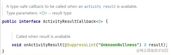 ActivityResultCallback是单一方法接口,内部只有 onActivityResult 这一个方法,可以接受ActivityResultContract 中定义的输出类型的对象