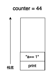 接下来 LOAD_GLOBAL 加载一个全局变量 print 函数 counter 变成 42 ,LOAD_CONST 加载字符串 "a == 1" 进入栈空间,counter = 44,此时状态如下:
