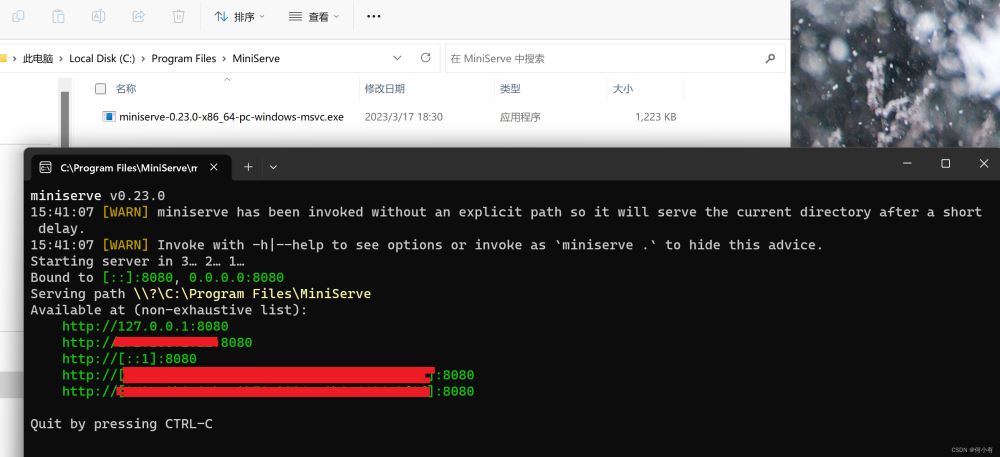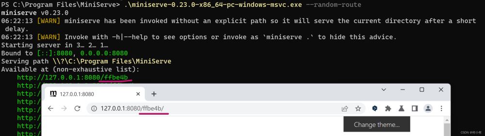 cd "C:\Program Files\MiniServe" .\miniserve-0.23.0-x86_64-pc-windows-msvc.exe --random-route
