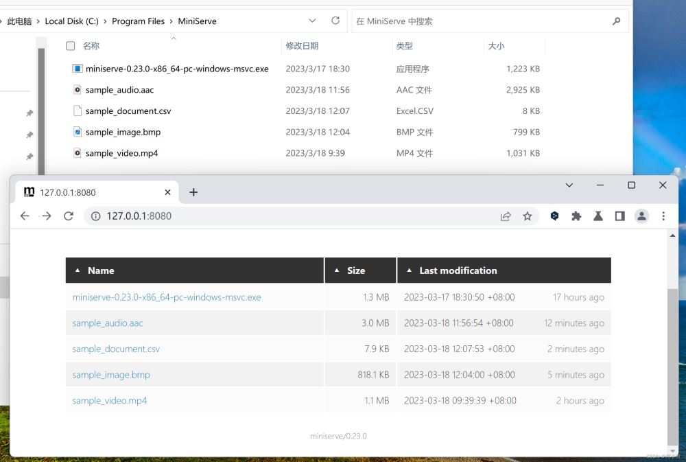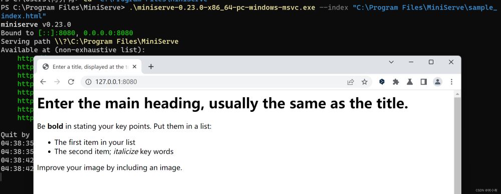 cd "C:\Program Files\MiniServe" .\miniserve-0.23.0-x86_64-pc-windows-msvc.exe --index "C:\Program Files\MiniServe\sample_index.html" # .\miniserve-0.23.0-x86_64-pc-windows-msvc.exe --spa --index "C:\Program Files\MiniServe\sample_index.html"