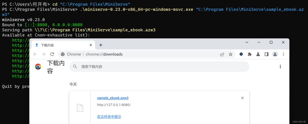 cd "C:\Program Files\MiniServe" .\miniserve-0.23.0-x86_64-pc-windows-msvc.exe "C:\Program Files\MiniServe\sample_ebook.azw3"