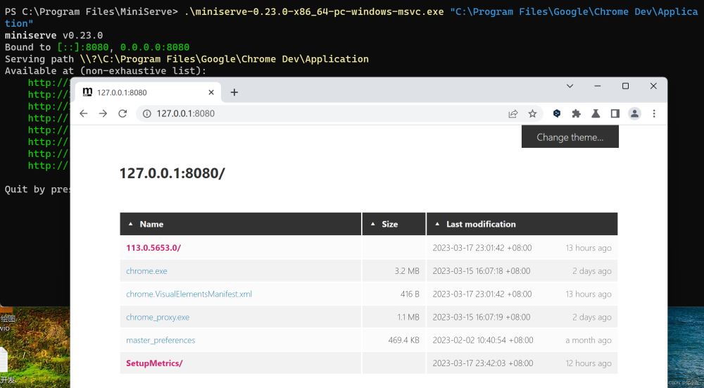 cd "C:\Program Files\MiniServe" .\miniserve-0.23.0-x86_64-pc-windows-msvc.exe "C:\Program Files\Google\Chrome Dev\Application"