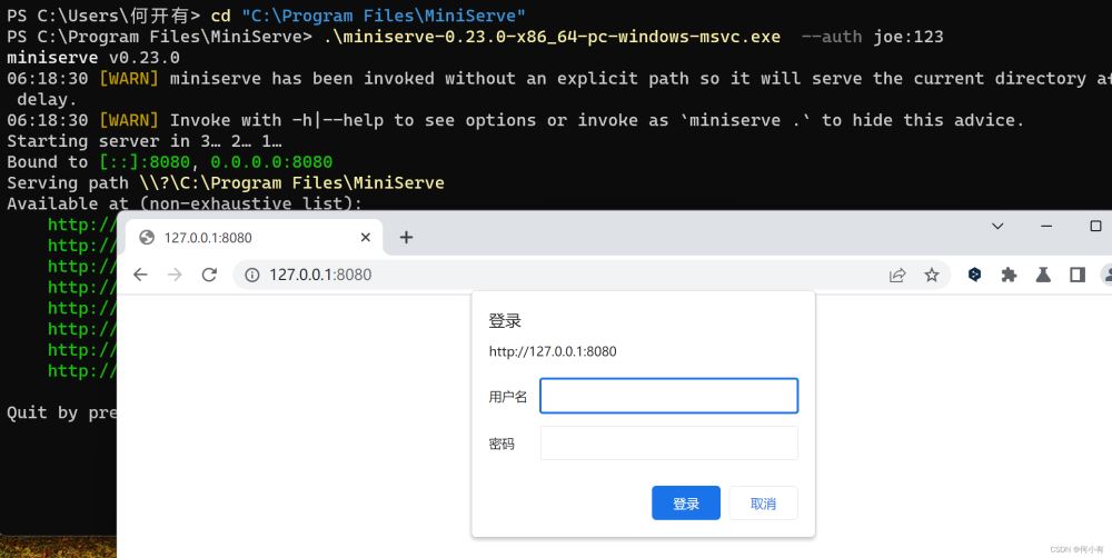 cd "C:\Program Files\MiniServe" .\miniserve-0.23.0-x86_64-pc-windows-msvc.exe --auth joe:123