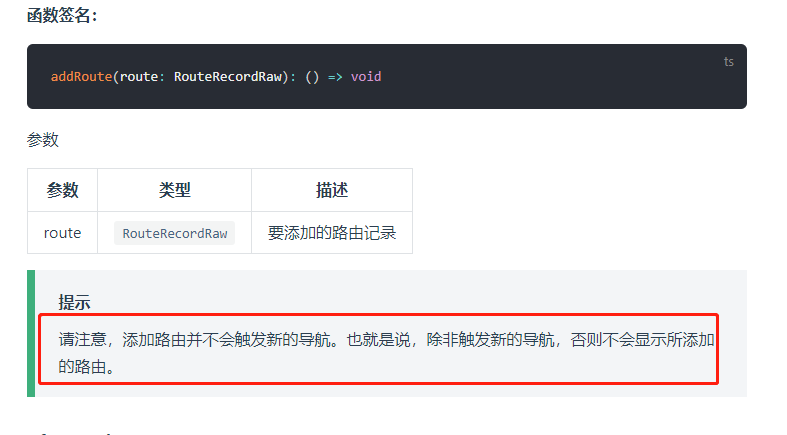 而在代码中,router.addRoute的触发是在路由导航守卫中检测到当前未保存动态菜单信息(vuex)。在这之后用next()放行,而根据官方提示和控制台相关打印信息可以看到,warn提示在addRouter添加路由之前,所以解决方法是将next()改为next(to),触发新的一个导航,此时可以正确匹配到动态路由的相应地址。
