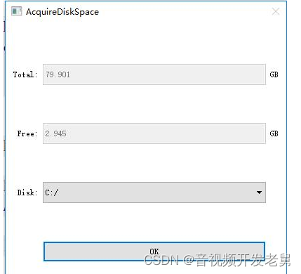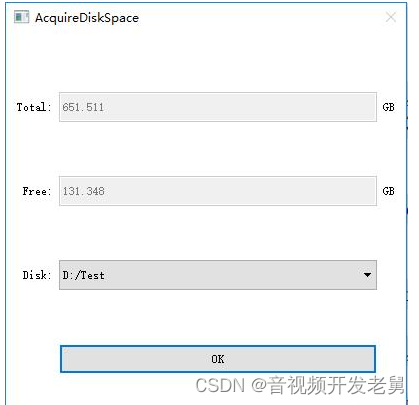 项目中用到了监测某磁盘(如:C盘、D盘等)的总容量和可用容量,查了一下,发现其实挺简单,调用一个Windows自带的API:GetDiskFreeSpaceEx( ... )就可以解决。用Qt做了一个测试例子,如下所示。