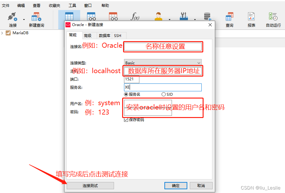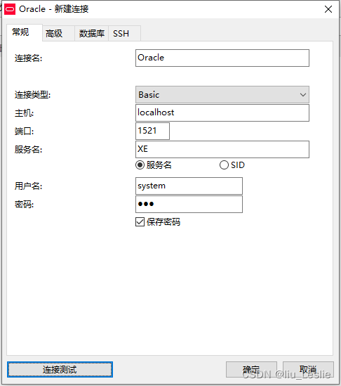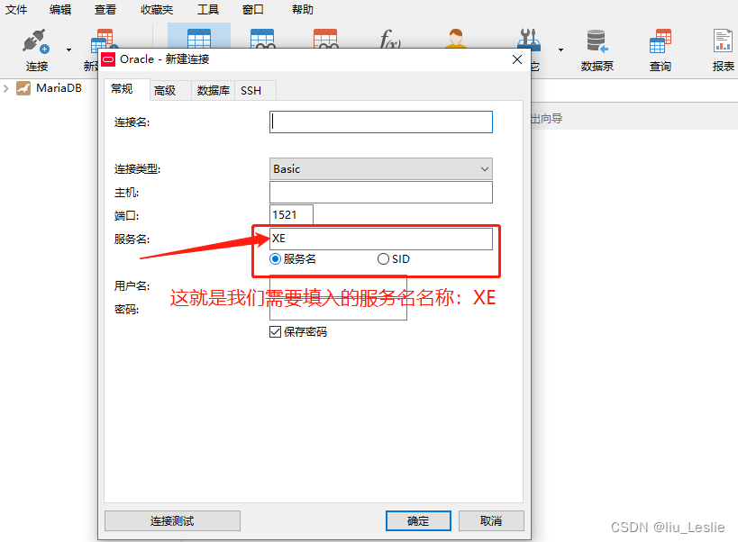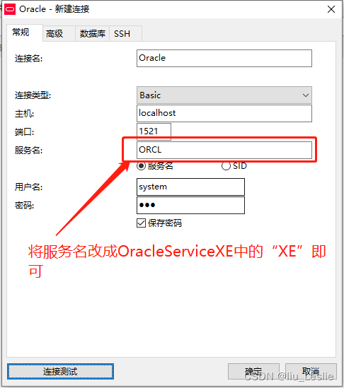 将服务名改成XE;“XE”就是之前从计算机管理中的服务与应用程序中查找到的服务OracleServiceXE中截取的后缀服务名。如下图: