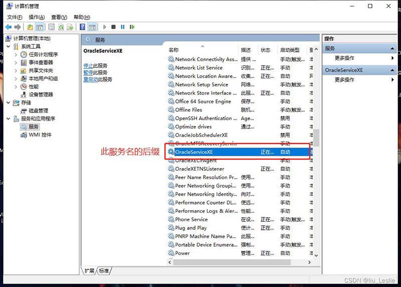 5、新建连接中有一点 “服务名” 需要注意,此服务名需要通过:右击计算机(我的电脑) --> 管理 --> 找到服务和应用程序 --> 点击服务打开服务列表,==找到OracleServiceXE服务名,==将 “XE” 作为服务名填入连接界面中的服务名选项。如下图: