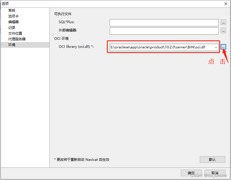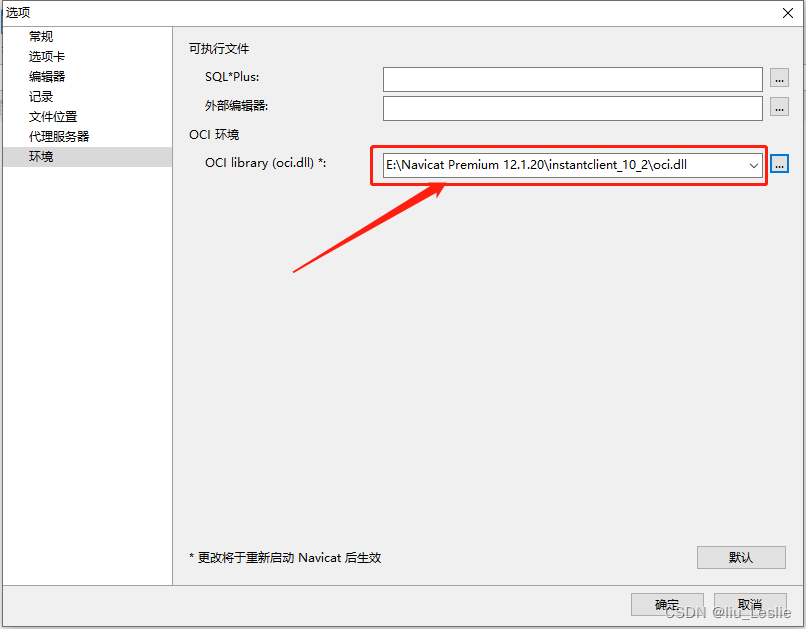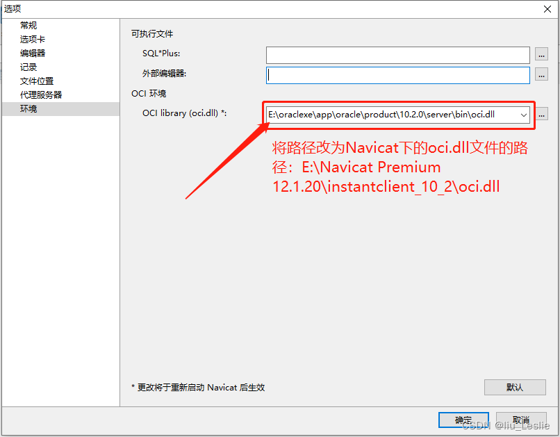 将Oracle路径改为Navicat下的oci.dll文件的路径。 E:\Navicat Premium 12.1.20\instantclient_10_2\oci.dll