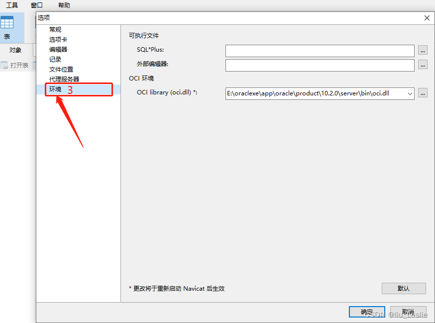 2、进入环境界面后,可以看到OCI环境选项中的 --> OCI library (oci.dll) * :E:\oraclexe\app\oracle\product\10.2.0\server\bin\oci.dll(此处的路径是我安装Navicat软件后默认存在的),我们需要修改此oci.dll文件的路径,否则会报错。
