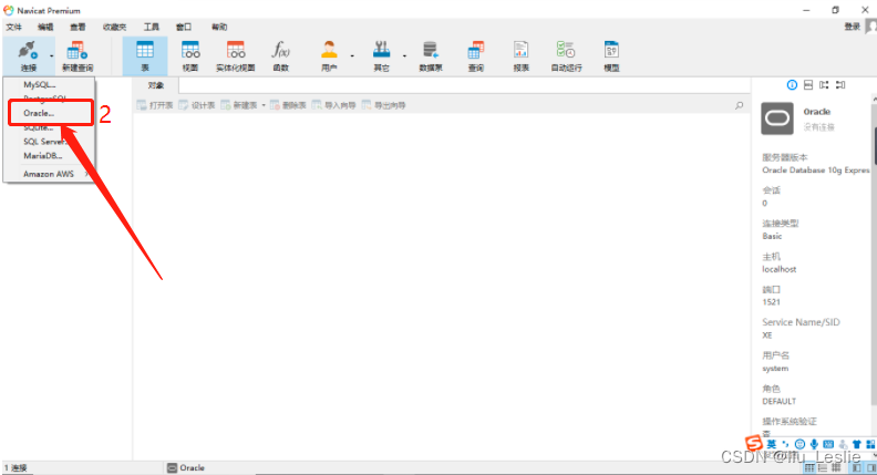 4、连接Oracle数据库,依次点击:连接 --> Oracle 进行新建连接 ; 如下图: