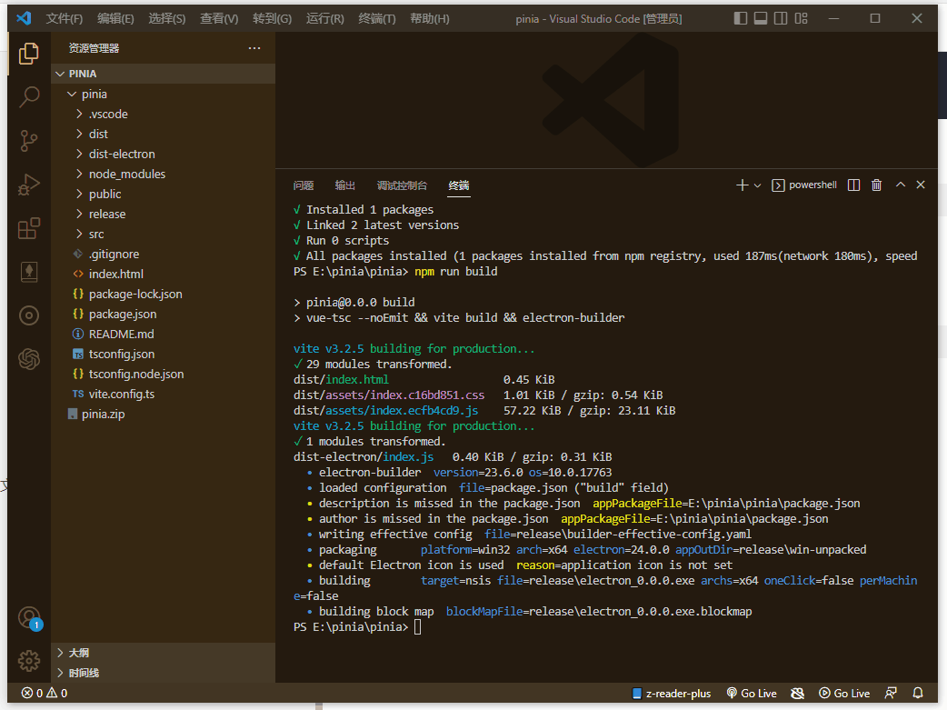 - 将 script 中的 build 指令修改为 vue-tsc --noEmit && vite build && electron-builder