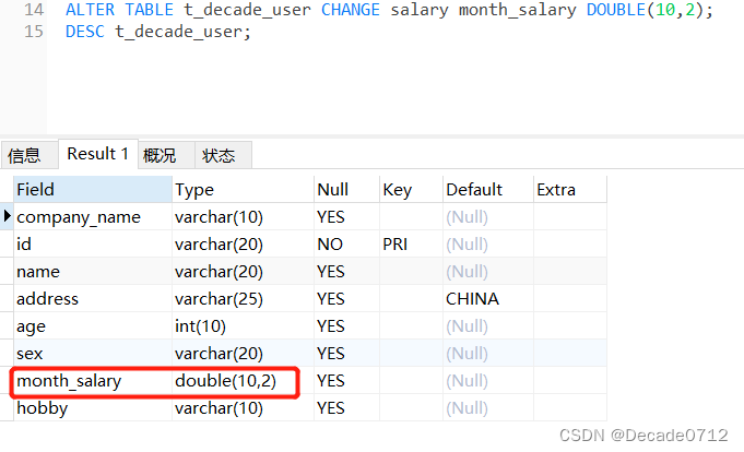 ALTER TABLE t_decade_user CHANGE salary month_salary DOUBLE(10,2); DESC t_decade_user;