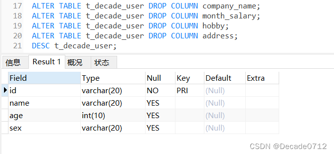 ALTER TABLE t_decade_user DROP COLUMN company_name; ALTER TABLE t_decade_user DROP COLUMN month_salary; ALTER TABLE t_decade_user DROP COLUMN hobby; ALTER TABLE t_decade_user DROP COLUMN address; DESC t_decade_user;