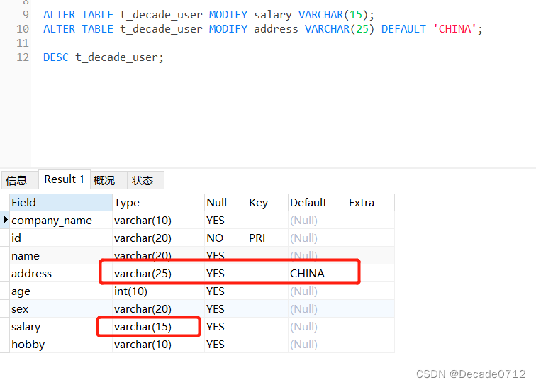 ALTER TABLE t_decade_user MODIFY salary VARCHAR(15); ALTER TABLE t_decade_user MODIFY address VARCHAR(25) DEFAULT 'CHINA'; DESC t_decade_user;
