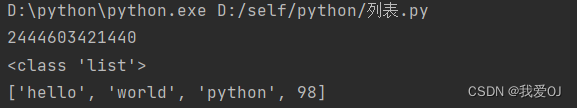 lst = ['hello','world','python',98] print(id(lst)) //查看标识 print(type(lst)) //查看数据类型 print(lst) //输出值