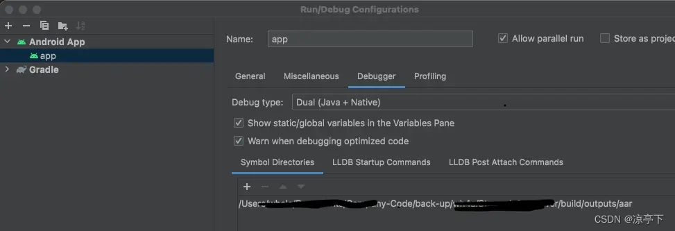 在Run -> Edit Configuration的配置页面,Debugger -> Symbol Directories里面添加第一步生成debug aar的代码目录。