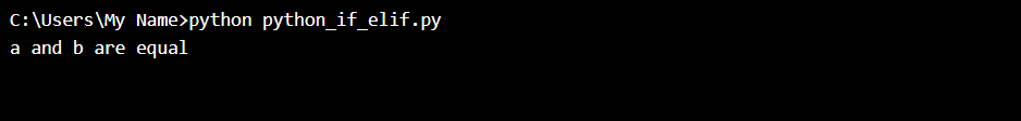 在这个例子中,a 等于 b,所以第一个条件不成立,但 elif 条件为 true,所以我们打印屏幕“a 和 b 相等”。