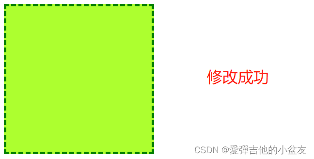<template> <div ref="squareRef"> </div> </template> <script setup> import {onMounted, ref} from 'vue' const squareRef = ref() onMounted(() => { //ref修改DOM节点样式,DOM操作document.getElementById('id')的写法一样,只不过去掉了.value,所以原理上是一样的 squareRef.value.style.width = '200px' squareRef.value.style.height = '200px' //这边样式名称有点小小的区别,在CSS中背景颜色的属性名称为:background-color,在style对象中的"-"符号不能用来引用属性值 //所以这边一律使用驼峰命名方式来调取CSS属性或赋值,background-color对应backgroundColor squareRef.value.style.backgroundColor = 'greenyellow' squareRef.value.style.border = '5px dashed green' }) </script>