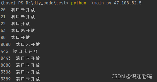 python main.py ip地址 端口列表用空格隔开即可 python ./main.py 114.114.114.114 53 22 80