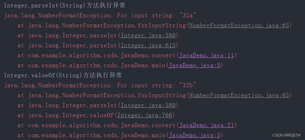 从执行结果可见,这段代码分别在Integer.parseInt(String)方法和Integer.valueOf(String)位置触发了NumberFormatException,其原因都是被转换的字符串中存在英文字母,无法转换成整型。