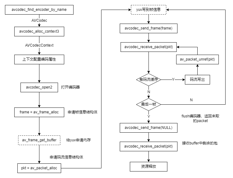 buffer_frame,然后触发一帧编码,将编码出的码流赋值到buffer_pkt - avcodec_receive_packet: 收流接口,检查上下文中是否有已经编码好的码流