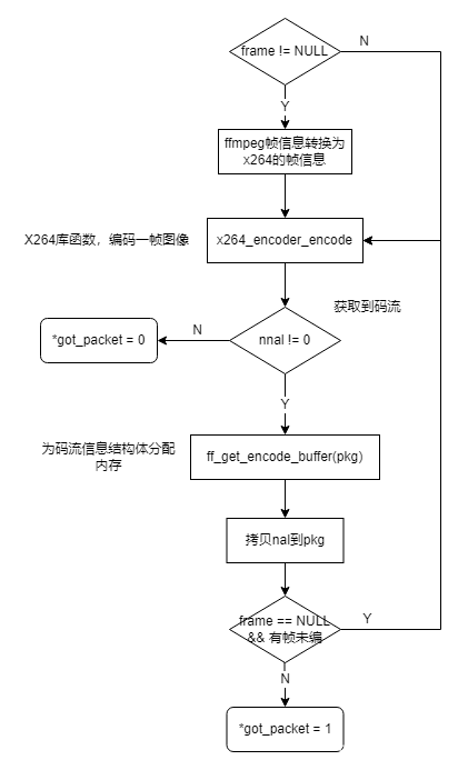 nvenc没有实现encode接口,这里参考libavcodec/libx264.c的实现,libx264的流程比较繁琐,总结为流程图如下,x264_encoder_encode为非阻塞接口,内部存在yuv的拷贝,调用后不一定会获取到一帧编码好的码流,但获取到之后,同样需要拷贝到输出pkt中