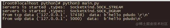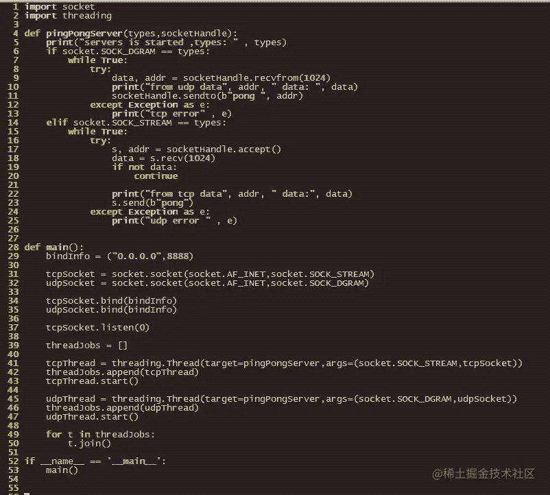 有了上述的python基础,我们可以来写一个最简单的ping/pong服务,不过我们想同时监听tcp流 和 udp数据包,代码如下: