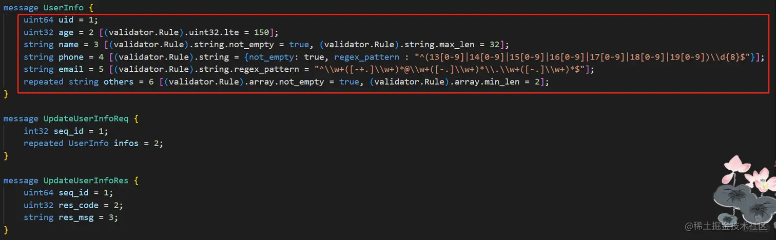 }上述校验规则和字段属性扩展定义在validator.proto文件中,使用时通过import导入该proto文件便可以使用上述扩展字段属性用于定义字段,如: