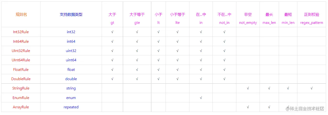 首先针对常用的协议字段数据类型(int32、int64、uint32、uint64、float、double、string、array、enum)定义了一套最常用的字段校验规则,如下表: