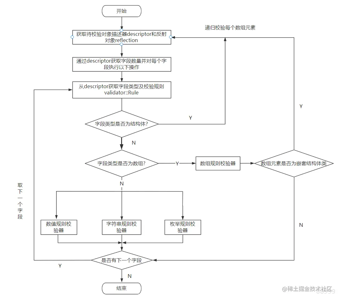 有了上述接口字段定义后,需要校验的字段都已经带上了validator.Rule属性,其中已包含了对应字段的校验规则,接下来需要实现一个参数自动校验算法, 基本思路就是通过反射逐个获取待校验Message结构体中各个字段值及其字段属性中校验规则validator.Rule,然后逐一匹配字段值是否满足每一项规则定义,不满足则返回FALSE;对于嵌套结构体类型则做递归校验,算法流程及实现如下:
