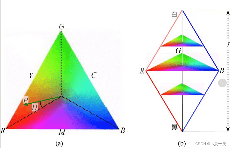 - 强度分量与图像的彩色信息无关,是独立的, 也就是强度/亮度分量的变换并不改变图像的色调和饱和度。