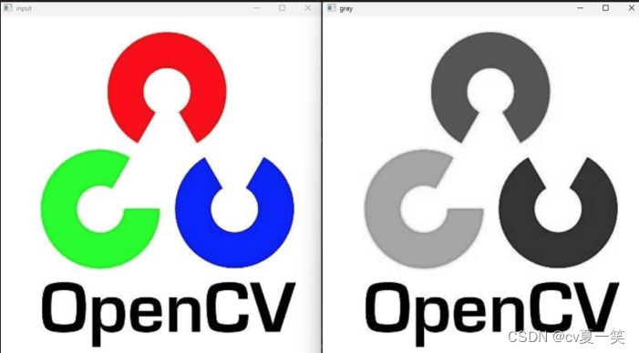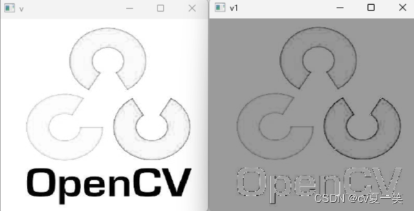 def main(): # 读取图像 src = cv.imread("../imgs/opencv.png") # 转换HSV空间 hsv = cv.cvtColor(src, cv.COLOR_BGR2HSV) # 分离通道 h, s, v = cv.split(hsv) cv.namedWindow("v", cv.WINDOW_NORMAL) cv.imshow("v", v) # 减小亮度 v1 = v - 30 cv.namedWindow("v1", cv.WINDOW_NORMAL) cv.imshow("v1", v1) cv.waitKey(0) cv.destroyAllWindows()