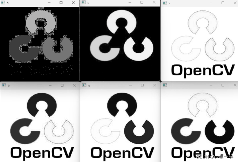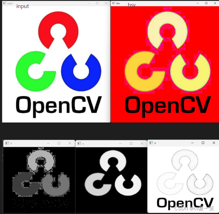 def main(): src = cv.imread("../imgs/opencv.png") cv.namedWindow("input", cv.WINDOW_AUTOSIZE) cv.imshow("input", src) hsv = cv.cvtColor(src, cv.COLOR_BGR2HSV) cv.imwrite('hsv.png', hsv) cv.imshow("hsv", hsv) # 分离通道 h, s, v = cv.split(hsv) cv.namedWindow("h", cv.WINDOW_NORMAL) cv.imshow("h", h) cv.namedWindow("s", cv.WINDOW_NORMAL) cv.imshow("s", s) cv.namedWindow("v", cv.WINDOW_NORMAL) cv.imshow("v", v) cv.waitKey(0) cv.destroyAllWindows() if __name__ == "__main__": main()