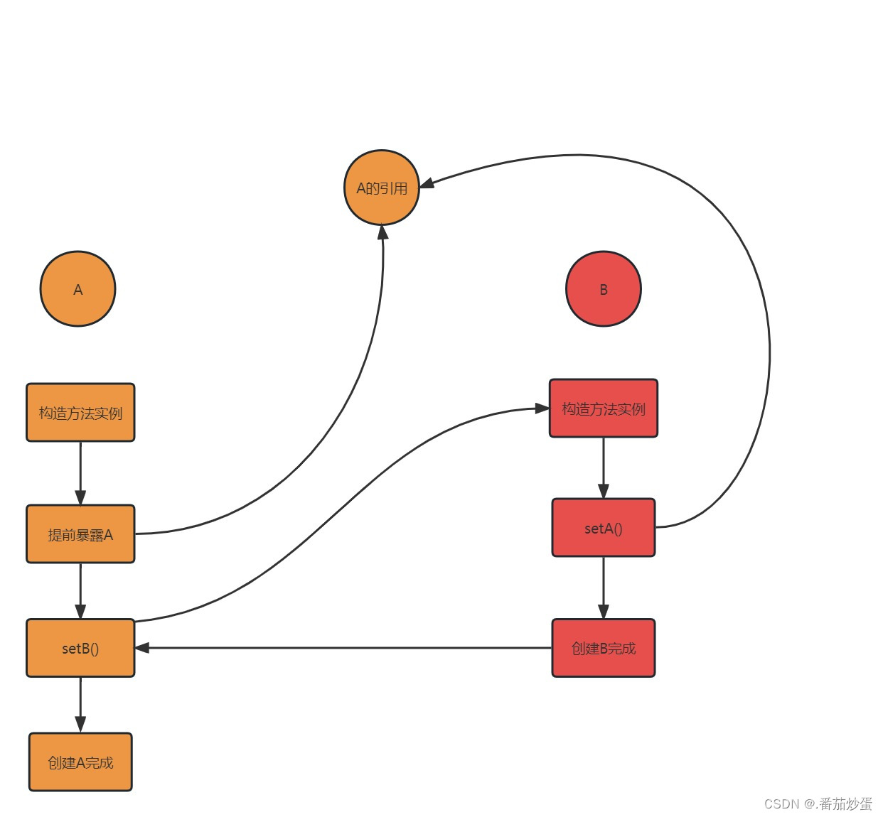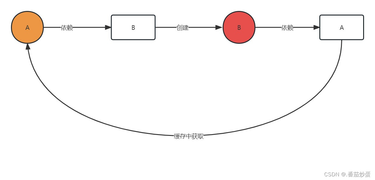 首先我们要明确一点就是如果这个对象A还没创建成功,在创建的过程中要依赖另一个对象B,而另一个对象B也是在创建中要依赖对象A,这种肯定是无解的,这时我们就要缓缓思路,我们先把A创建出来,但是还没有完成初始化操作,也就是这是一个半成品对象,然后再赋值的时候提前把A暴露出来,然后创建B,让B创建完成后找到暴露出来的A完成整体的实例化,这时再把B交给A完成A的后续操作.从而解决循环依赖,也就是下图: