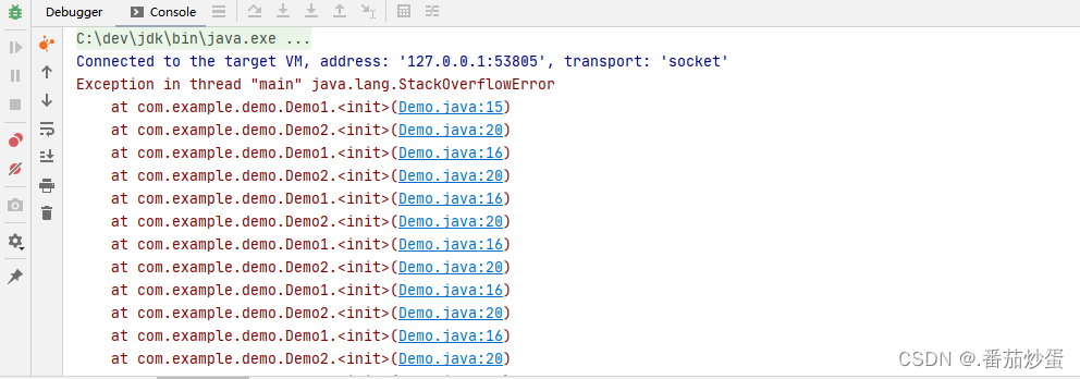 上述代码就是最基本的循环依赖的场景,Demo1依赖Demo2,Demo2依赖Demo1,然后就报错了,而上面的这种设计情况是无解的.